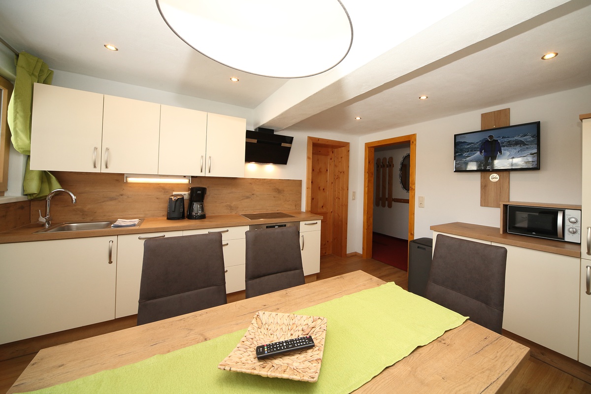 Über den Vorraum gelangt man in die Küche mit Esstisch. Diese ist komplett ausgestattet mit Geschirrspüler, Backrohr, Mikrowelle, Kühlschrank, E-Herd, Kaffeemaschine und Wasserkocher.