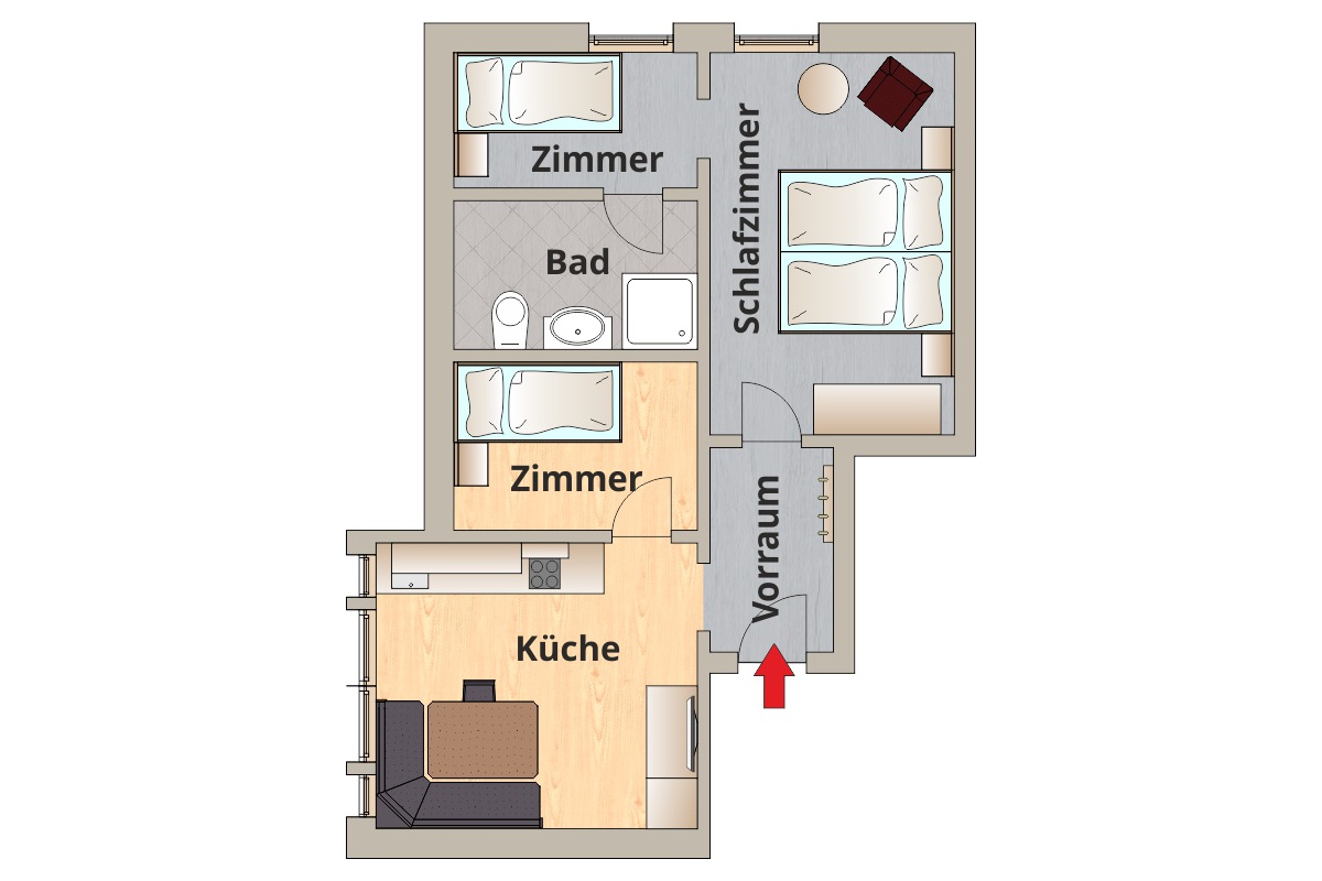 Im Schlafzimmer finden Sie ein Doppelbett, ein Einzelbett und ebenso wie in der Küche ein Flat-Screen mit Sat-Anschluss. WLAN steht Ihnen natürlich im gesamten Appartement gratis zur Verfügung.